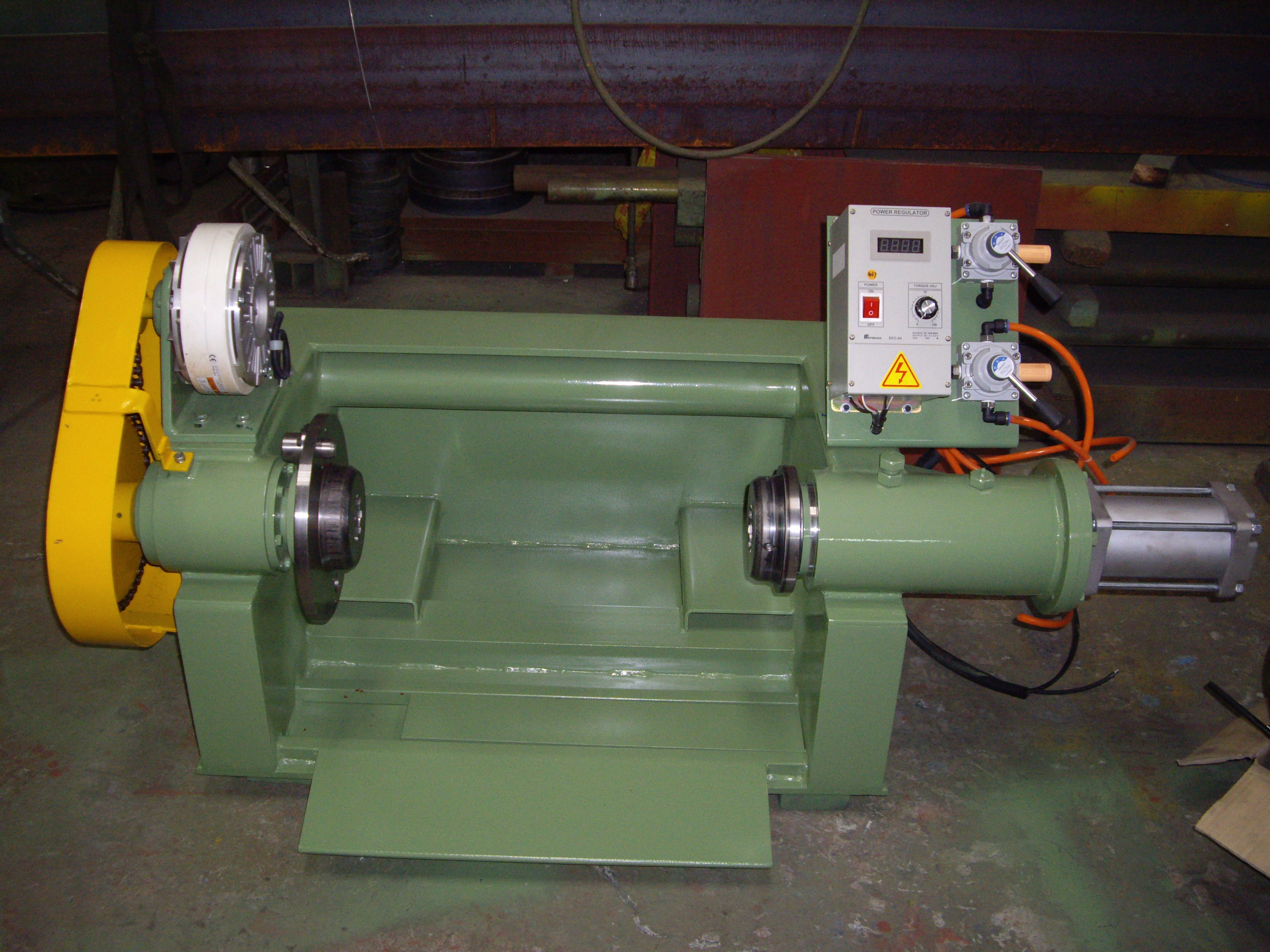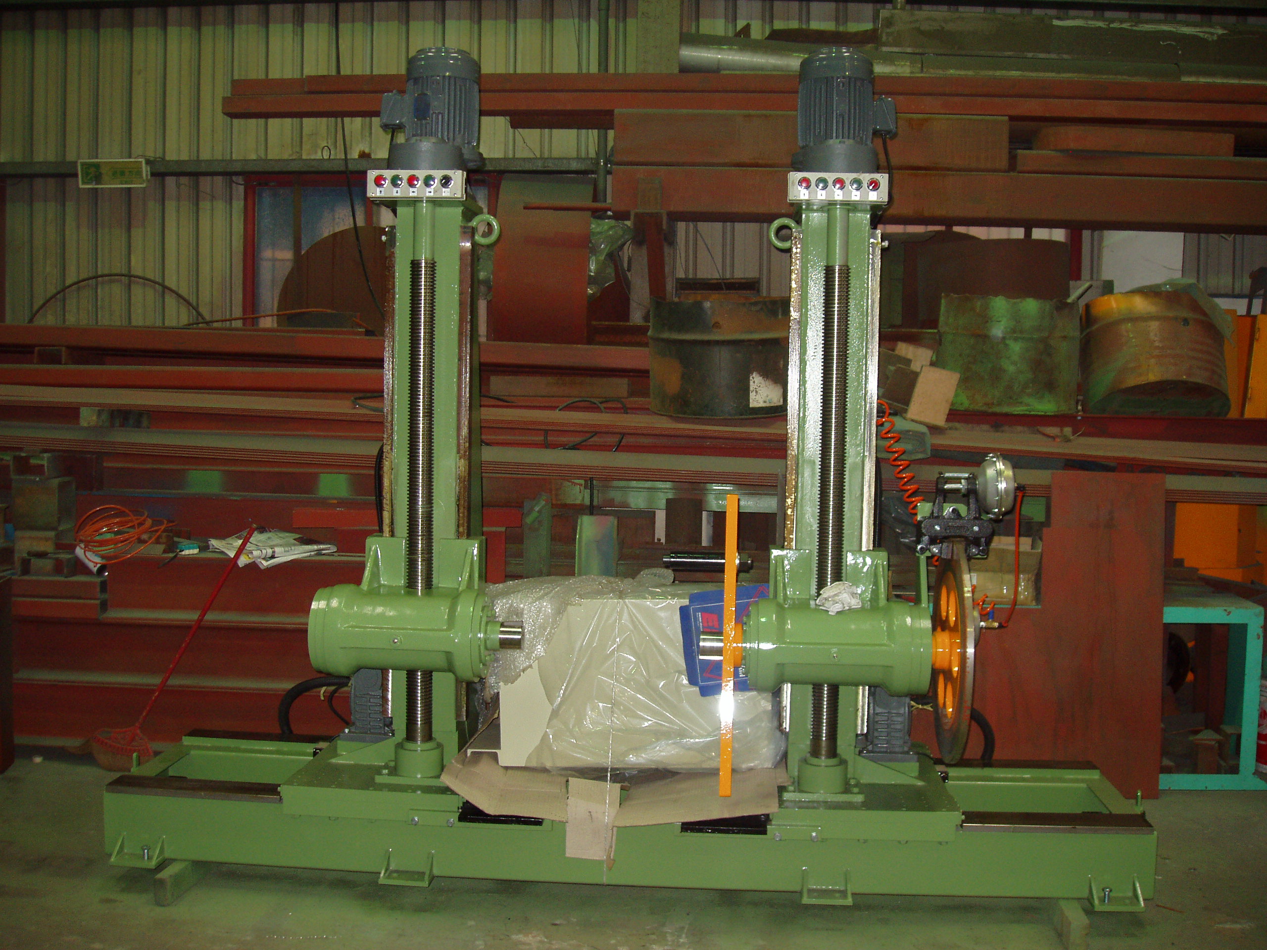 功能:將半成品銅線放入放線機上,當生產電線之生產線開始運作時,放線機就會同步將銅線放出。屬於前段的機械。
